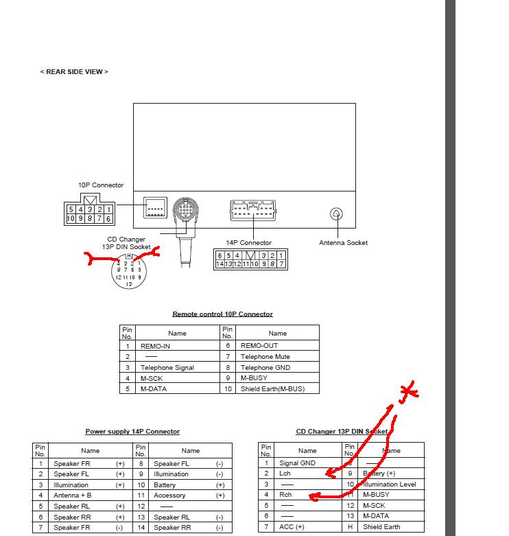 Our 6 stacker MN141332 / DY-3a66u-AL has a 14 pin connector at rear !4 pin is catered for in cable instructions but connector is different - Cable instructions depict two rows of 7 while we have 6 plus 8 and the slots are all occupied Instructions say Black to 14, red to 13 and white to 12, but these are Speaker RR (-), Speaker LR (-) and ---- respectively I had no luck whatsoever in trying to remove the existing pins I have now also noticed that the male pins on back of radio are too big for the connectors supplied - they are of the smaller size tht fit the 10 pin connector that is input for phone etc Pin out diagram attached from radio workshop manual Back to the drawing board Next step will be to hunt up the 13 pin DIN to apple cable I have somewhere and try that to see if AUX mode works via tha input BTW I have the .pdf radio manual if it is of use to anyone - will email to admin (Radio_rear_s.jpg) Attachments ---------------- Radio_rear_s.jpg (202KB - 4432 downloads) | ||